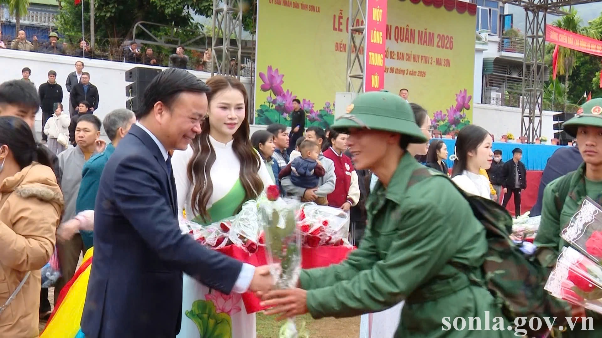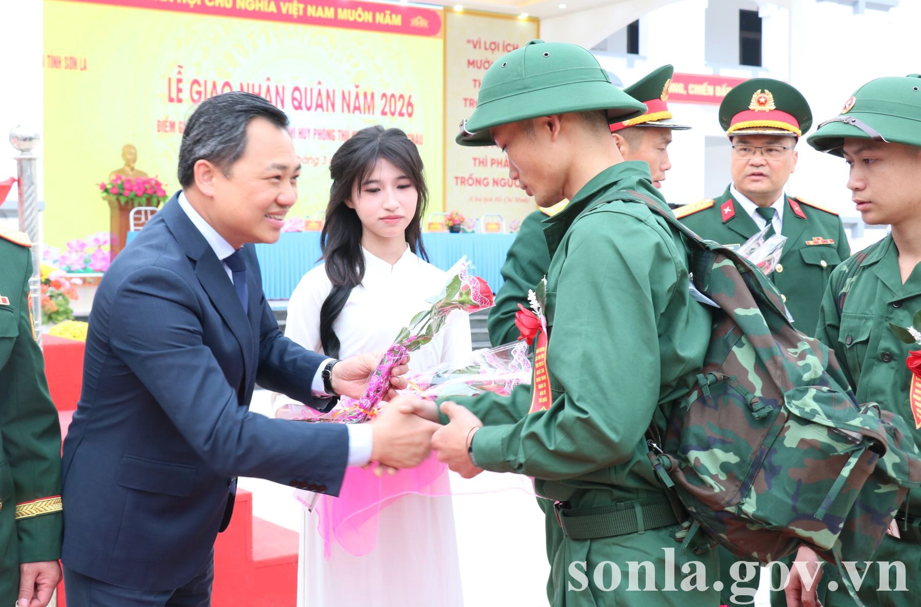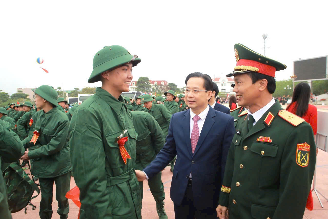 Đồng chí Chủ tịch UBND tỉnh tặng hoa chúc mừng, động viên tân binh lên đường tòng quân