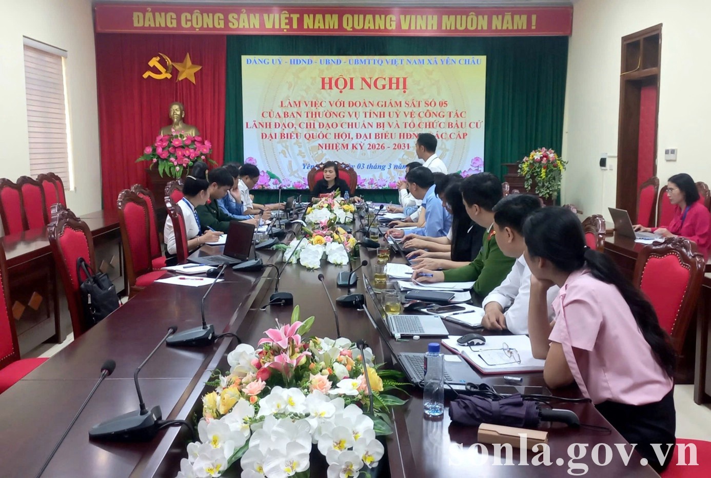 (sonla.gov.vn) Ngày 03/3, Đoàn giám sát số 05 do đồng chí Lường Thị Vân Anh, Ủy viên Ban Thường vụ Tỉnh ủy, Trưởng Ban Nội chính Tỉnh ủy làm Trưởng đoàn, cùng Đoàn công tác của tỉnh đã đi kiểm tra công tác chuẩn bị bầu cử đại biểu Quốc hội và đại biểu HĐND các cấp tại xã Yên Châu. Tiếp và làm việc với Đoàn về phía xã Yên Châu có các đồng chí trong Thường trực Đảng ủy, HĐND, UBND, Ủy ban MTTQ Việt Nam xã; các cơ quan, đơn vị chuyên môn của xã.