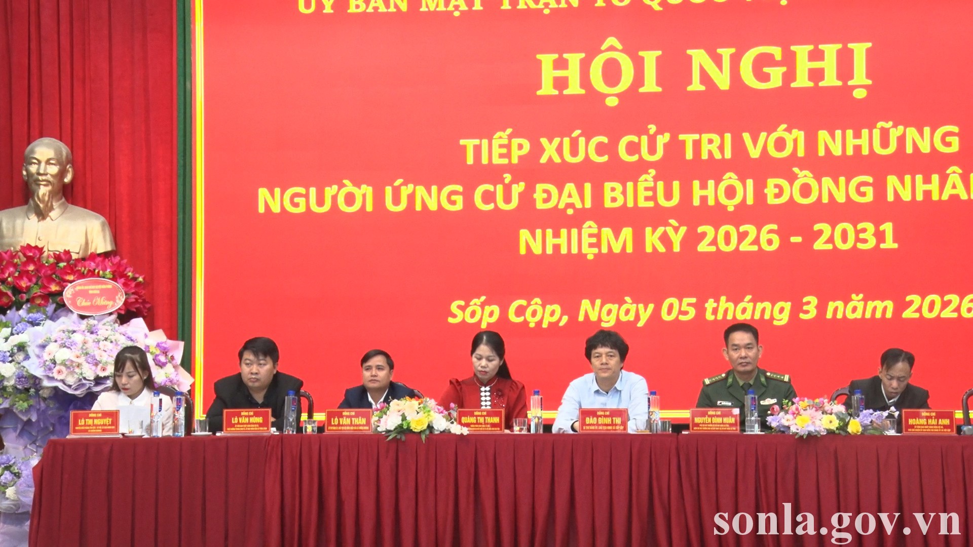 (sonla.gov.vn) Sáng ngày 05/3, Ủy ban MTTQ Việt Nam xã Sốp Cộp tổ chức Hội nghị tiếp xúc cử tri với những người ứng cử đại biểu Hội đồng nhân dân tỉnh nhiệm kỳ 2026 - 2031, thuộc Đơn vị bầu cử số 14. Dự hội nghị có các ứng cử viên đại biểu HĐND tỉnh và đông đảo cử tri xã Sốp Cộp.