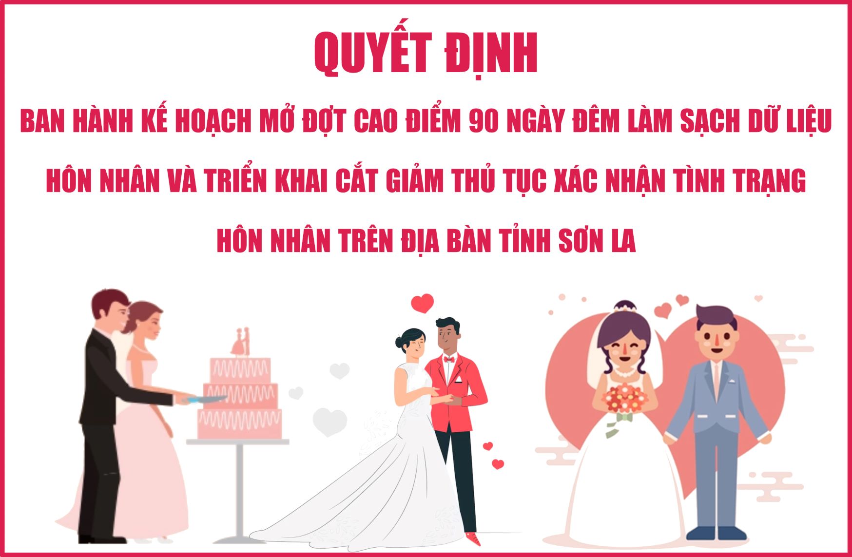 Infographic: Quyết định ban hành kế hoạch mở đợt cao điểm 90 ngày đêm làm sạch dữ liệu hôn nhân và triển khai cắt giảm thủ tục xác nhận tình trạng hôn nhân trên địa bàn tỉnh Sơn La